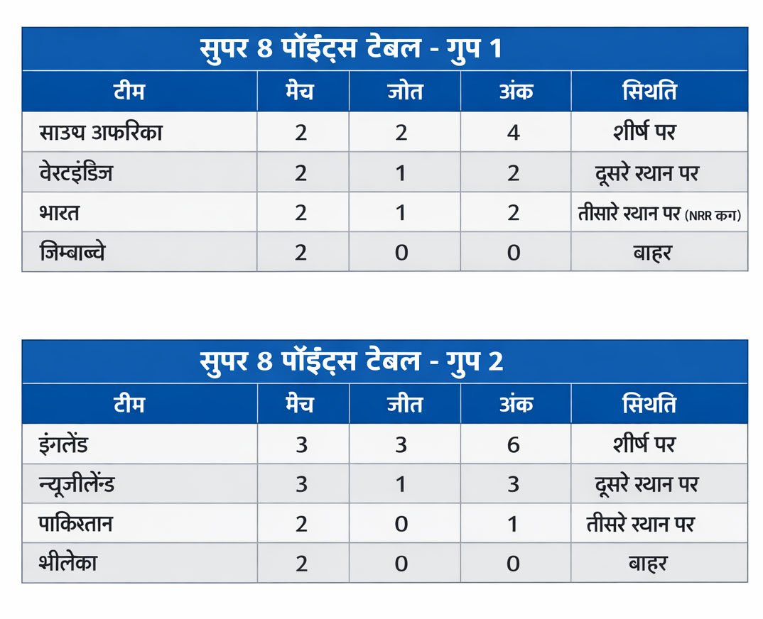 नई दिल्ली। भारत और श्रीलंका में खेले जा रहे टी20 वर्ल्ड कप 2026 का रोमांच चरम पर है। सुपर 8 के मुकाबले अब सेमीफाइनल की तस्वीर साफ़ कर रहे हैं। दो टीमें पहले ही क्वालीफाई कर चुकी हैं, जबकि बाकी दो स्थानों के लिए मुकाबला बेहद दिलचस्प हो गया है।